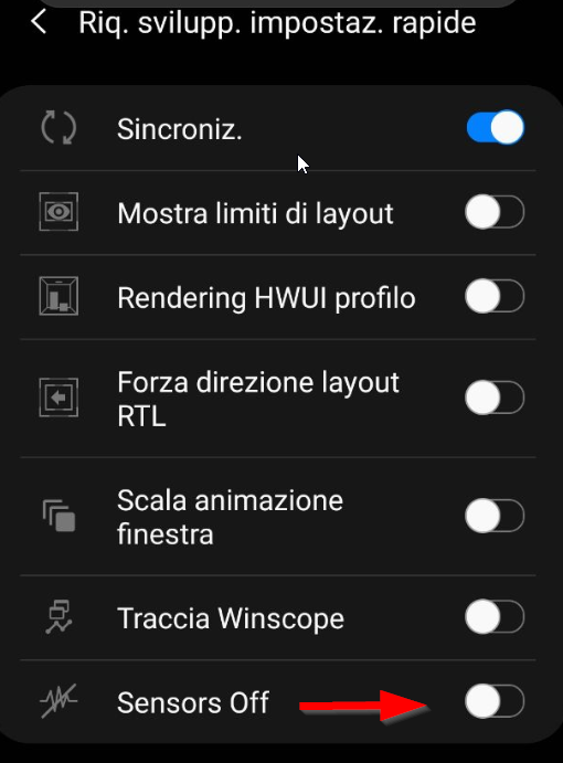 All’interno delle opzioni sviluppatore troverai una sezione chiamata “Riq. svilup. impostaz. rapide” dove puoi abilitare l’opzione “Sensors Off” nel pannello delle impostazioni rapide.