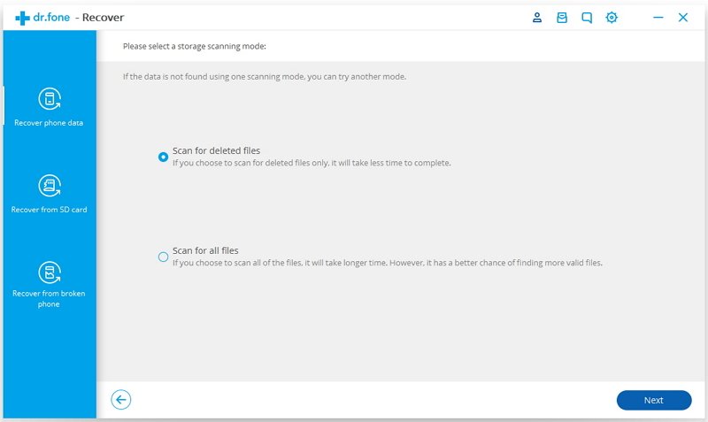 Dopo che il telefono è stato connesso correttamente, Dr.Fone per Android visualizzerà tutti i tipi di dati che supporta per il ripristino. Per impostazione predefinita, ha controllato tutti i tipi di file. Puoi semplicemente selezionare il tipo di dati che desideri recuperare. Se il tuo telefono non è rootato, Dr. Fone offrirà due opzioni: Cerca file eliminati e Cerca tutti i file. La scansione di tutti i file richiederà più tempo, ma eseguirà la scansione dei file in modo più accurato. Fai clic su “Avanti” per continuare il processo di recupero dei dati e il programma inizierà ad analizzare il tuo dispositivo.