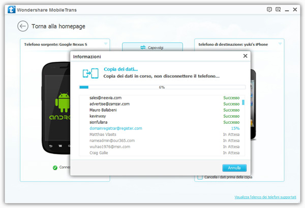 Il vantaggio principale nell’usare MobileTrans è che consente di fare il passaggio dei dati in modo diretto, senza fare le due operazioni di backup e ripristino in due fasi diverse. Inoltre, c’è da dire che MobileTrans è compatibile con quasi tutti i modelli e versioni di dispositivi Android, e supporta a pieno anche dispositivi Apple iOS.