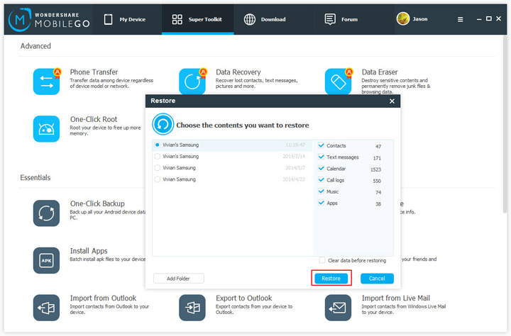 1. Dopo aver salvato il file di backup sul tuo computer e collegato il nuovo cellulare, avvia nuovamente il programma TunesGO. A questo punto vai nella sezione Toolkit e clicca sull’icona Ripristino in un click.